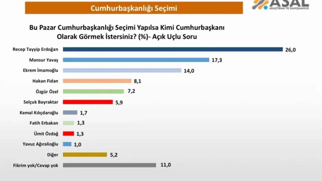 Asal Araştırma tarafından gerçekleştirilen “Bu pazar Cumhurbaşkanlığı seçimi yapılsa kimi Cumhurbaşkanı olarak görmek istersiniz?” başlıklı anketin sonuçları açıklandı. Ankete göre, seçmenler arasında dikkat çeken tercihler gözlemlendi.
