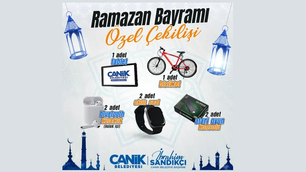 Canik Belediyesi çocukları, gençleri ve vatandaşları hediyelerle buluşturduğu çekiliş programlarına, Ramazan Bayramı Özel Çekilişi'yle devam ediyor. Ramazan Bayramı'nda yüzleri güldürmeye devam eden Canik Belediyesi, sosyal medya hesapları üzerinden düzenlediği çekiliş programıyla tablet, bisiklet, atari oyun konsolu, akıllı saat ve kulak içi bluetooth kulaklık hediye edecek. Canik Belediye Başkanı İbrahim Sandıkçı ve Canik Belediyesi sosyal medya hesapları üzerinden düzenlenen çekiliş programına vatandaşlar, 1 Nisan 2025 Salı günü saat 23.59'a kadar başvuruda bulunabilecek.
