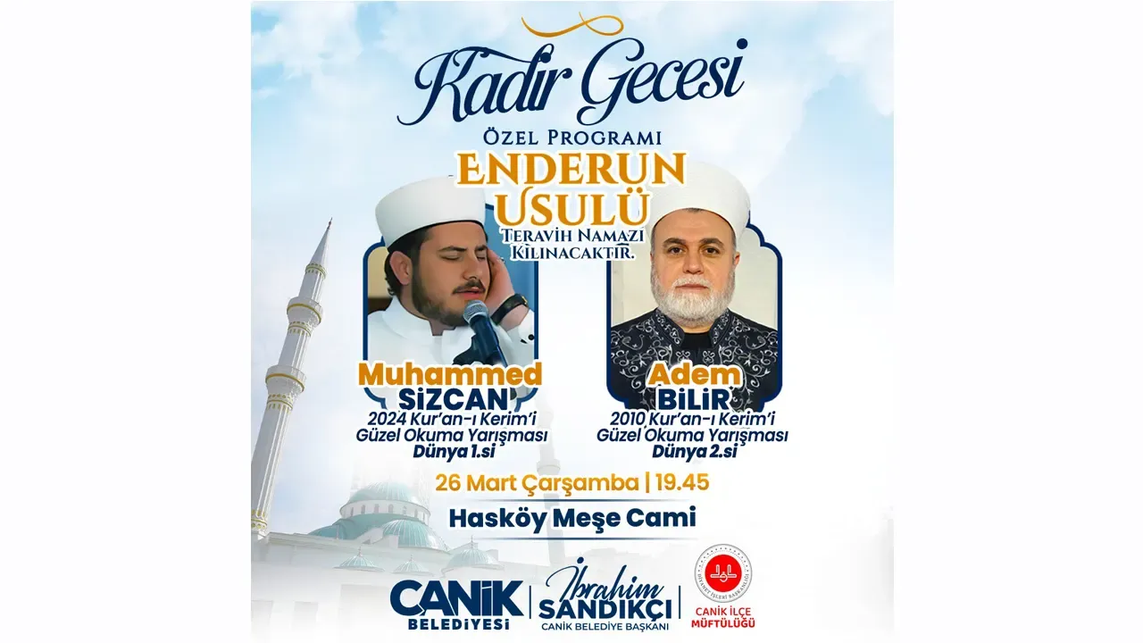 Canik Belediyesi'nin ilçede düzenleyeceği Kadir Gecesi Özel Programı'nda 2024 Kur'an-ı Kerim'i Güzel Okuma Yarışması Dünya Birincisi Muhammed Sizcan ve 2010 Kur'an-ı Kerim'i Güzel Okuma Yarışması Dünya İkincisi Adem Bilir tarafından Kuran'ı Kerim tilaveti gerçekleştirilecek. Mevlid-i Şerif ve kasidelerin seslendireceği programda ayrıca, Enderun Usulü teravih namazı kılınacak. Kadir Gecesi'nin dualarla idrak edileceği programda Canik Belediyesi vatandaşlara ikramlarda bulunacak.