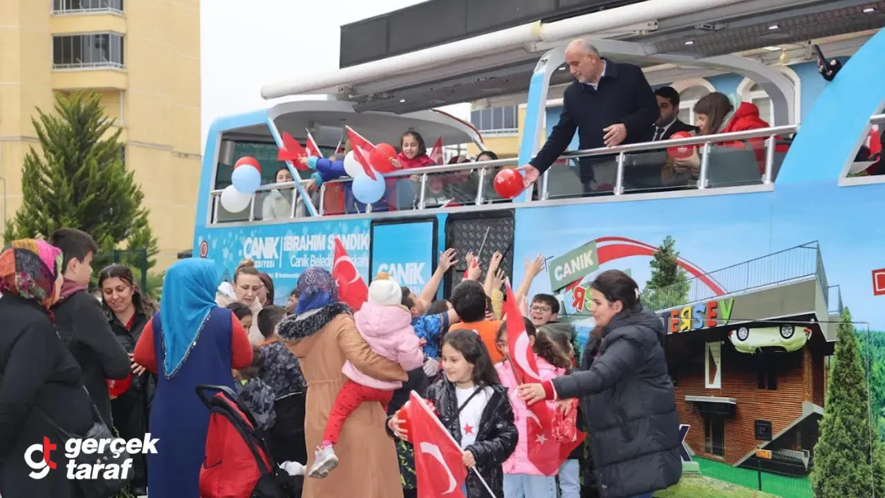 Canik Belediyesi'nin 23 Nisan’a özel hazırladığı kutlama etkinlikleri kapsamında, Belediye Başkanı İbrahim Sandıkçı çocuklarla birlikte otobüs turu yaptı. Mahalle mahalle dolaşan Başkan Sandıkçı, çocuklarla yakından ilgilenerek çeşitli hediyeler verdi. Otobüs turu sırasında vatandaşlar evlerinin balkonlarından Türk bayraklarıyla selam verirken, marşlara hep birlikte eşlik etti.