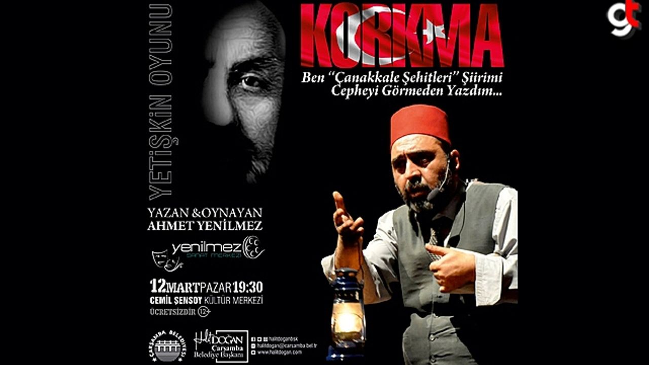 Çarşamba Belediyesi 12 Mart İstiklal Marşı’nın Kabulü’nün yıl dönümde ‘Korkma’ isimli tiyatro oyununu Çarşambalılarla buluşturuyor. Sevilen oyuncu Ahmet Yenilmez’in yazdığı ve oynadığı tek kişilik oyun; "İstiklal Şairi" Mehmet Akif Ersoy'un hayatından kesitleri ve Çanakkale Destanı'nı anlatıyor. Yetişkin oyunu türündeki oyun 12 Mart Pazar günü saat 19.30’da Cemil Şensoy Kültür Merkezinde ücretsiz olarak sahnelenecek. ‘Korkma’ isimli tiyatro oyununda 12 yaş sınırı bulunuyor.