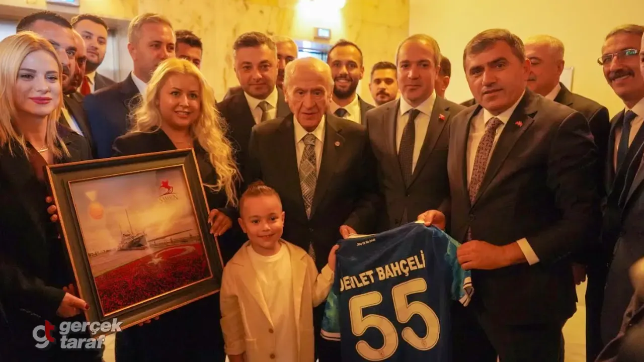Bahçeli’ye, Atatürk Onur Anıtı ve TBMM tarafından Samsun’a verilen İstiklal Madalyası’nın da yer aldığı Bandırma Vapuru’nun özel tablosu ile üzerinde ismi yazılı Samsunspor forması hediye edildi.