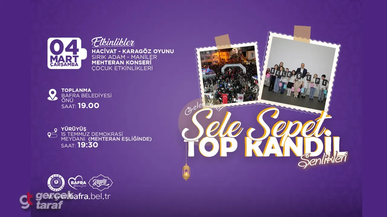 Samsun’un Bafra ilçesinde Ramazan ayının simge etkinliklerinden biri haline gelen Geleneksel Sele Sepet Top Kandil Şenlikleri için hazırlıklar tamamlandı. Bafra Belediyesi ev sahipliğinde düzenlenen program, bu yıl da çocuklar ve aileler için renkli görüntülere sahne olacak. Ramazan ayının 14’ünü 15’ine bağlayan gece gerçekleştirilecek etkinlikler, ilçede kandil coşkusunu sokaklara taşıyacak. Şenlik programı hem kültürel mirasın yaşatılmasını hem de birlik ve beraberlik duygusunun pekiştirilmesini amaçlıyor.