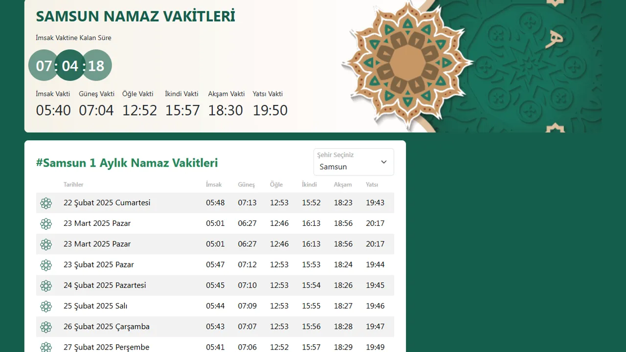 Samsun’da namaz vakitleri de vatandaşlar tarafından yoğun olarak araştırılıyor. İşte Samsun için bugün namaz vakitleri: