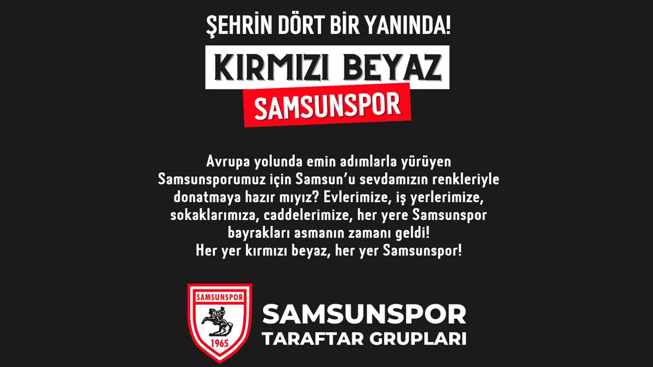 "Avrupa yolunda emin adımlarla yürüyen Samsunsporumuz için Samsun'u, sevdamızın renkleriyle donatmaya hazır mıyız? Evlerimize, iş yerlerimize, sokaklarımıza, caddelerimize, her yere Samsunspor bayrakları asmanın zamanı geldi! Her yer kırmızı-beyaz, her yer Samsunspor!"