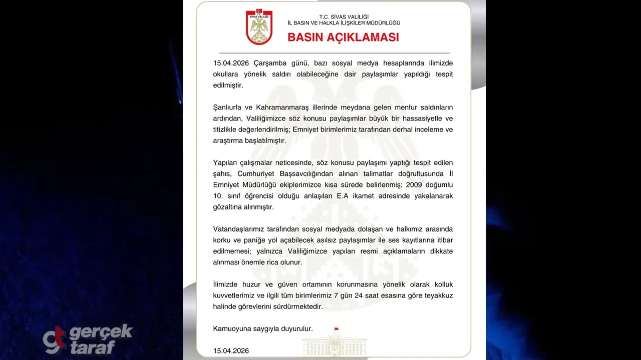Son dakika gelişmesi olarak, Sivas Valiliği, sosyal medyada “okullara yönelik saldırı” iddiasıyla paylaşım yapan bir şüphelinin yakalandığını duyurdu. Şanlıurfa ve Kahramanmaraş’ta yaşanan üzücü olayların ardından ortaya atılan bu iddialar, Valilik tarafından hassasiyetle ele alındı . Emniyet birimleri tarafından başlatılan inceleme sonucunda paylaşımı yapan şahsın kimliği kısa sürede tespit edildi. 2009 doğumlu ve 10. sınıf öğrencisi olduğu öğrenilen E.A., ikamet adresinde yakalanarak gözaltına alındı . Valilik, vatandaşları asılsız paylaşımlara itibar etmemeleri konusunda uyarırken, güvenlik güçlerinin 7 gün 24 saat görev başında olduğunu bildirdi.