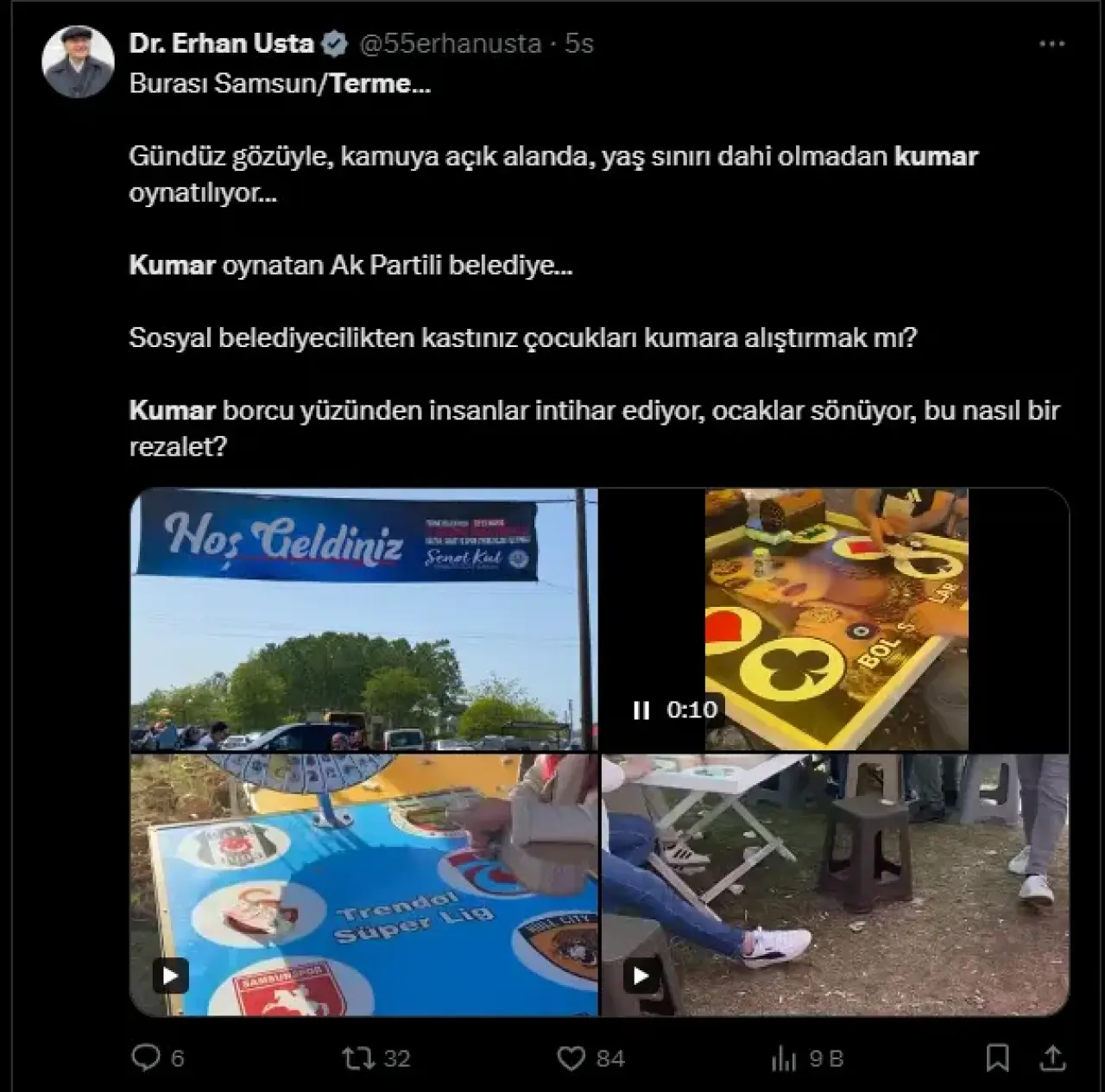 “Burası Samsun/Terme… Gündüz gözüyle, kamuya açık alanda, yaş sınırı dahi olmadan kumar oynatılıyor… Kumar oynatan AK Partili belediye… Sosyal belediyecilikten kastınız çocukları kumara alıştırmak mı? Kumar borcu yüzünden insanlar intihar ediyor, ocaklar sönüyor, bu nasıl bir rezalet?”